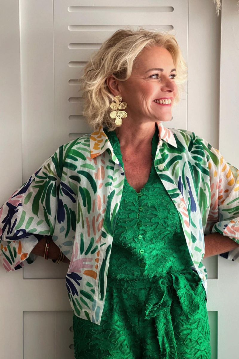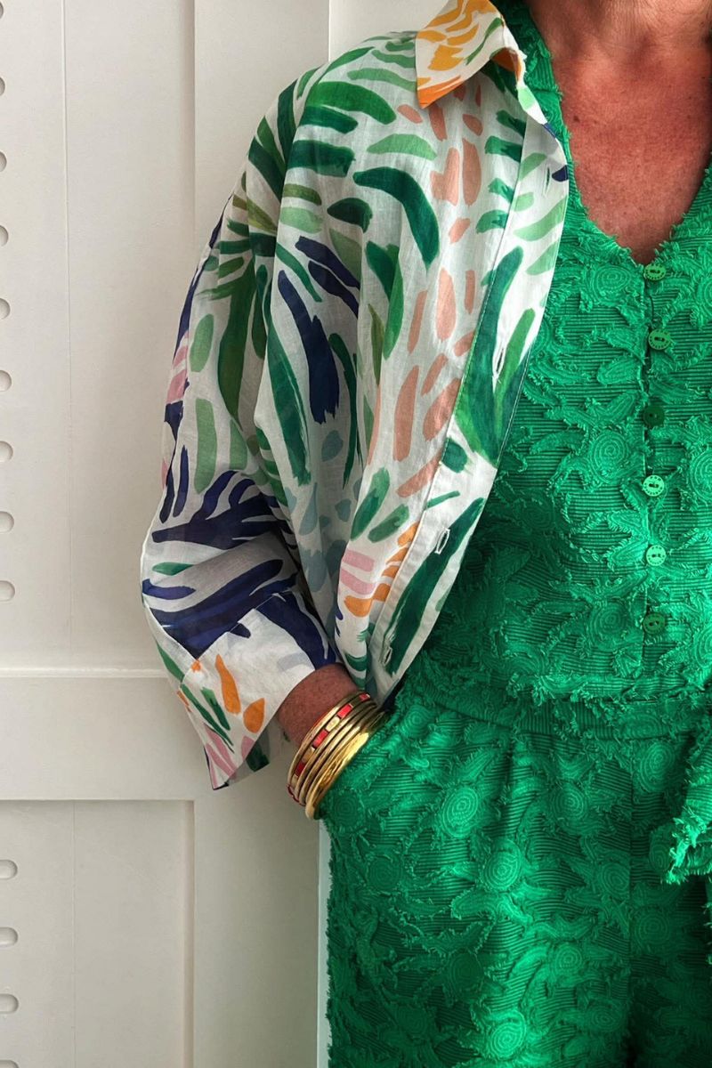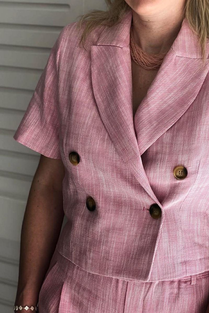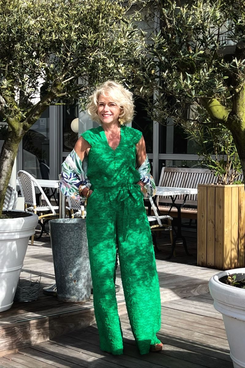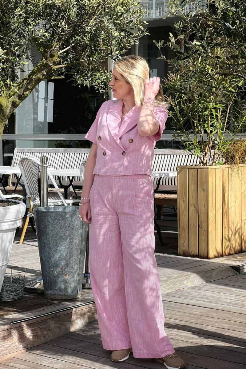 Sandrine porte une combinaison verte signée POM, pièce forte au tombé fluide et à l’allure affirmée, sublimée par la chemise imprimée Sacrécœur qui apporte une touche artistique et libre ; Sophie incarne quant à elle une élégance douce et lumineuse avec un ensemble deux pièces rose POM, le pantalon et le blazer, mêlant structure et légèreté dans un esprit résolument contemporain.