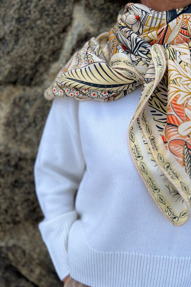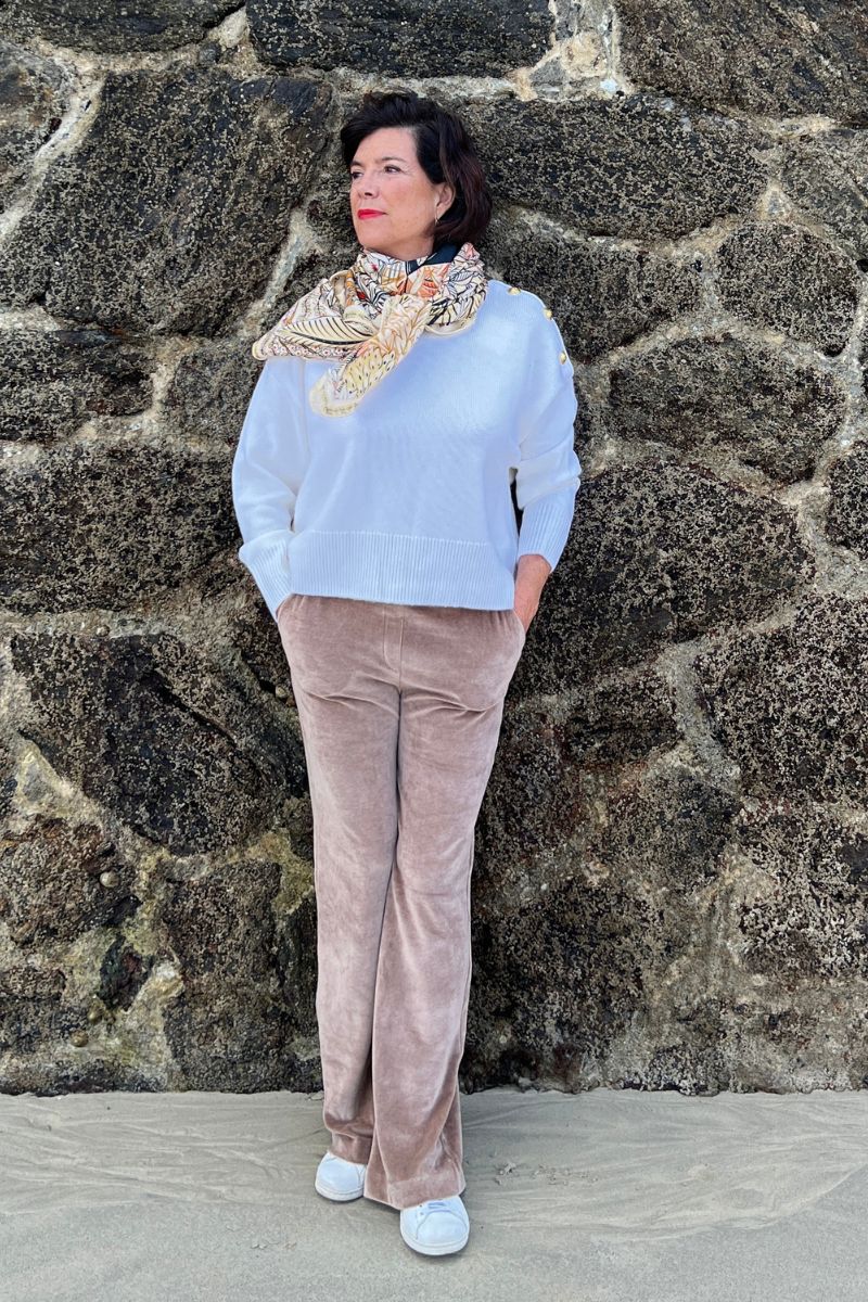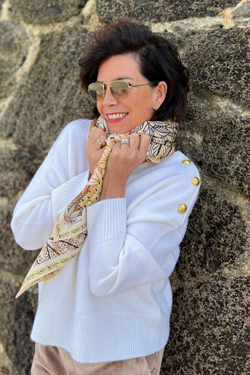 Le pull blanc aux boutons dorés vient ajouter une touche lumineuse. Ses détails précieux à l’épaule apportent ce petit « twist » qui transforme une pièce essentielle en un véritable atout mode.