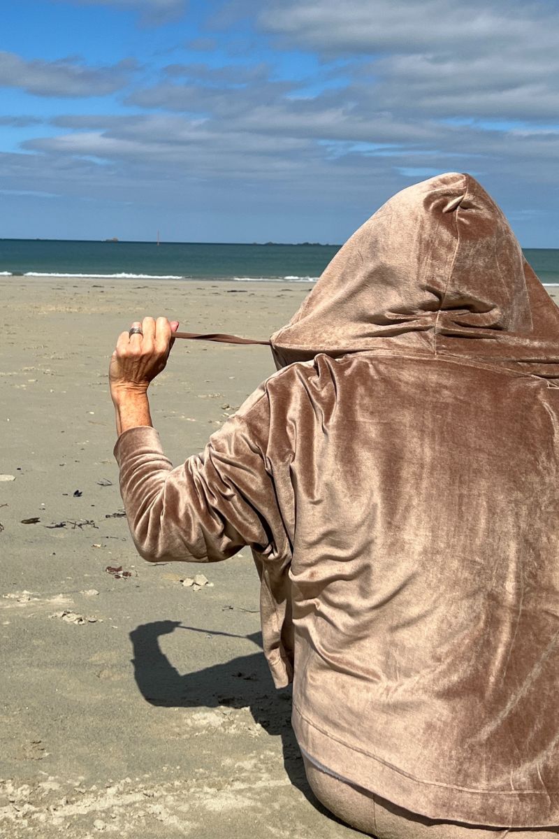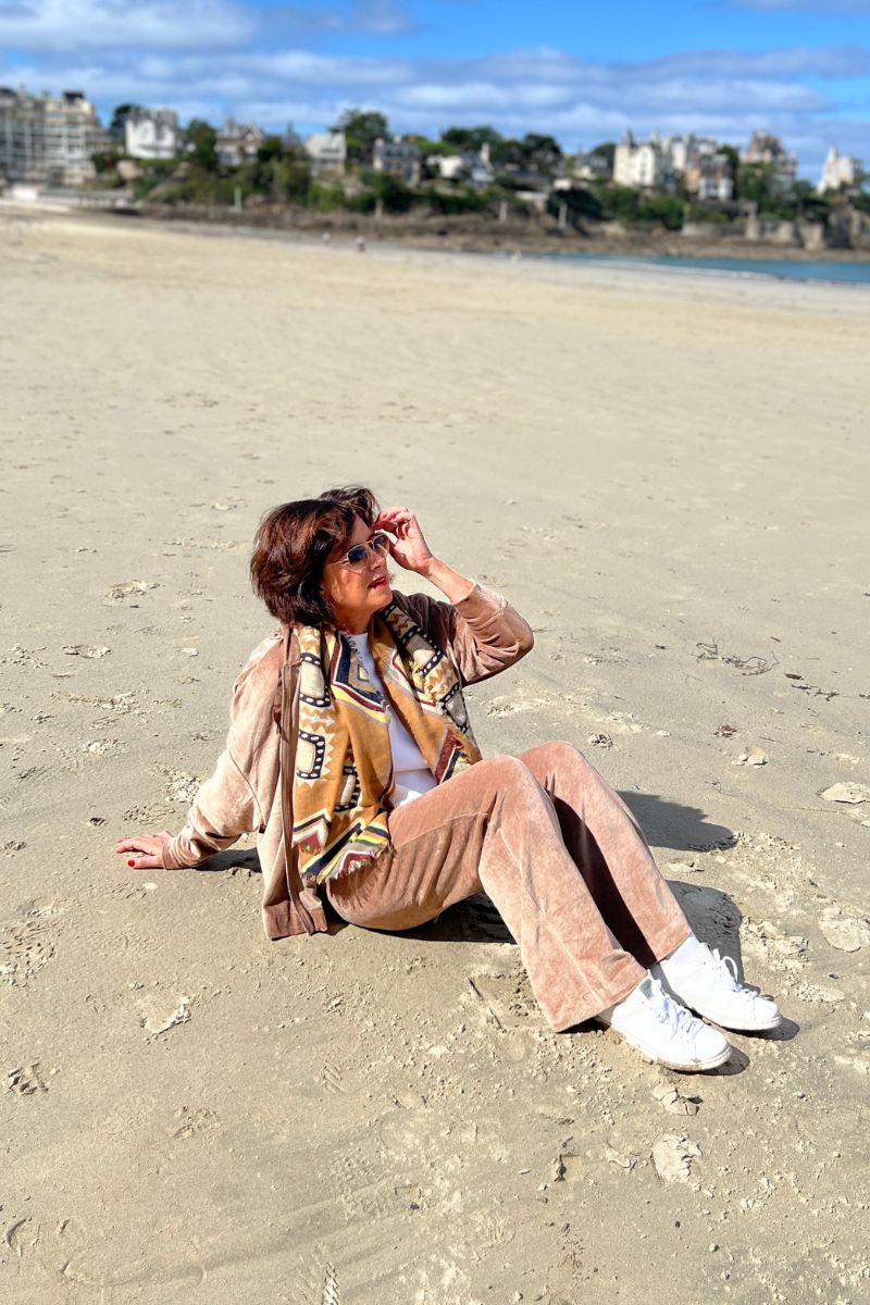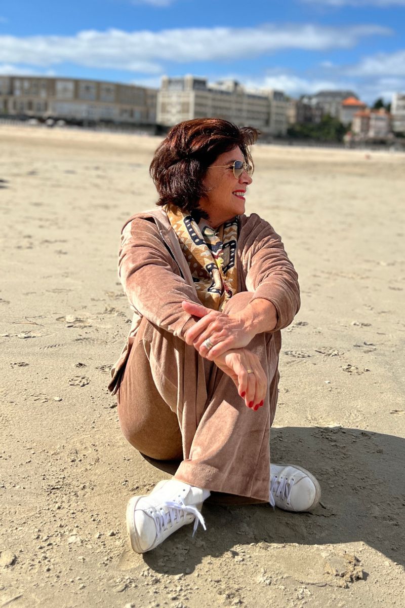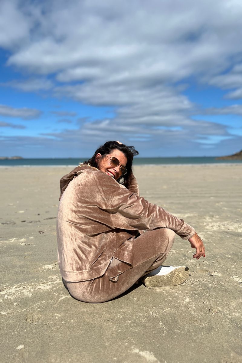 On aime l’ensemble en velours beige-doré, qui attire la lumière avec subtilité. Sa coupe fluide et son toucher délicat en font une tenue à la fois confortable et sophistiquée, idéale pour une promenade en bord de mer comme pour une soirée élégante. Le velours, ici revisité par Majestic, devient une seconde peau : souple, chic, et incroyablement agréable à porter.