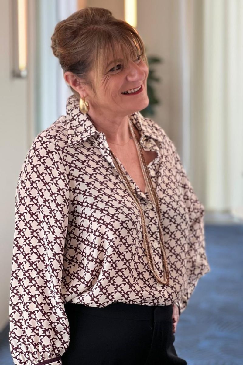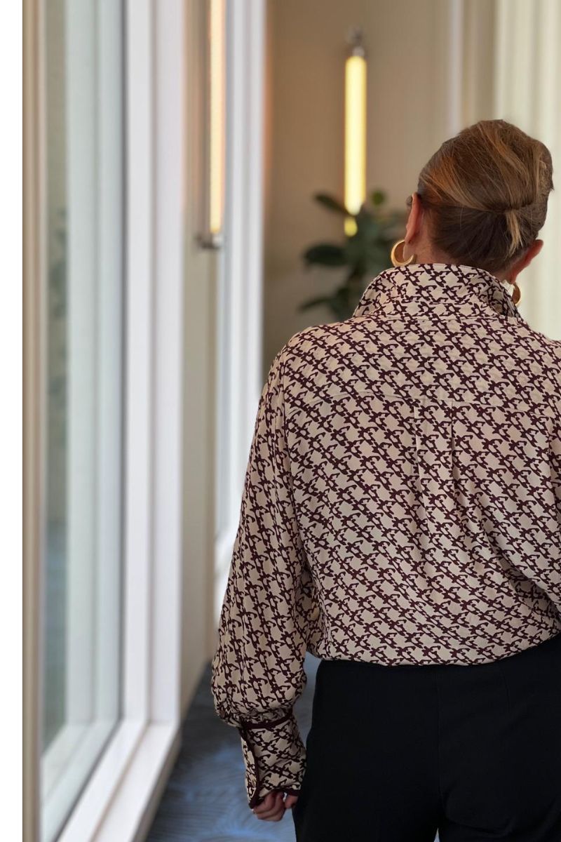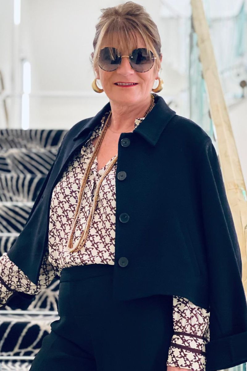 Le pantalon uni Gardeur, à la coupe impeccable, allonge la silhouette et apporte une base sobre et chic. Il est associé à une chemise imprimée Même Road dont le motif graphique insuffle du caractère et une touche mode affirmée. En superposition, la cape courte Closed, une pièce forte, moderne, qui structure l’ensemble.