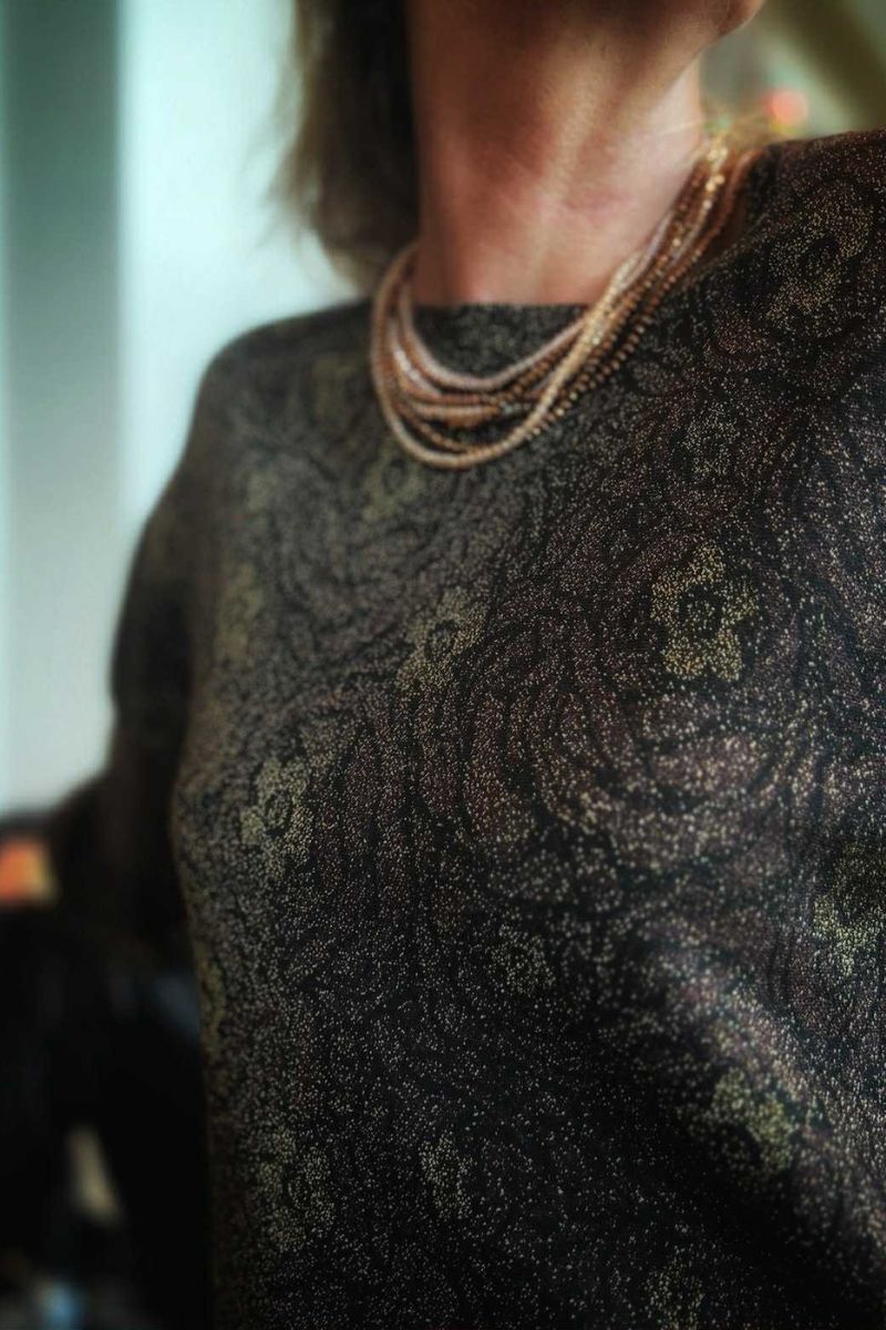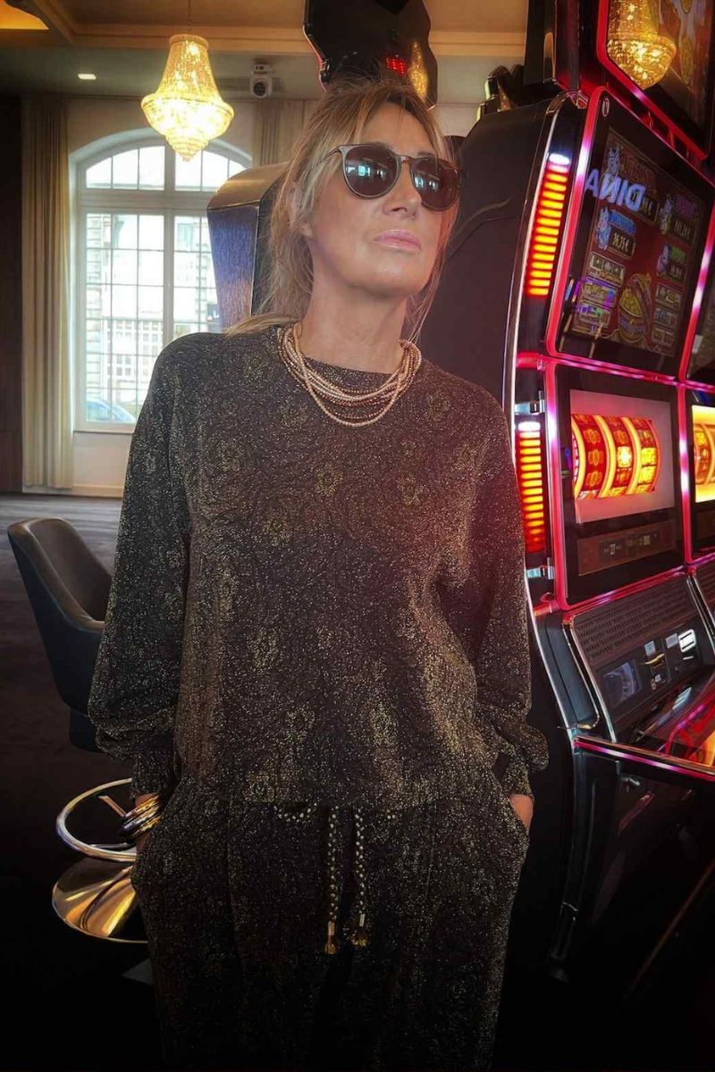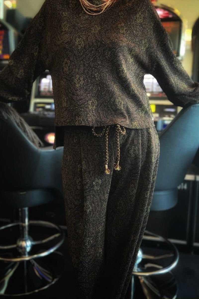 Isabelle porte un ensemble noir haut et bas signé MEME ROAD, confectionné dans une matière moirée, au relief subtil et à l’éclat délicat. Ce tissu donne toute sa profondeur à la silhouette et apporte une sophistication naturelle, sans ostentation.