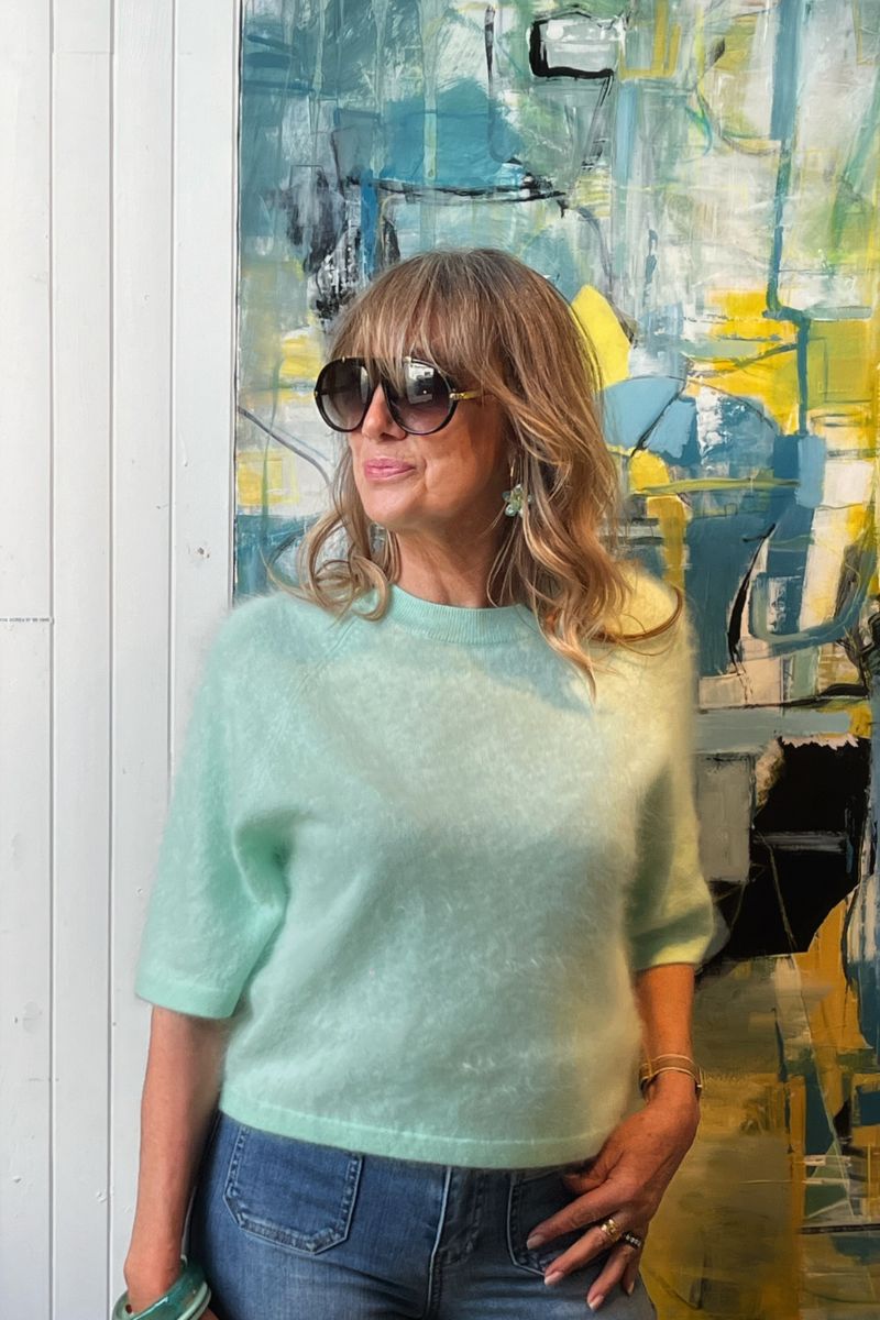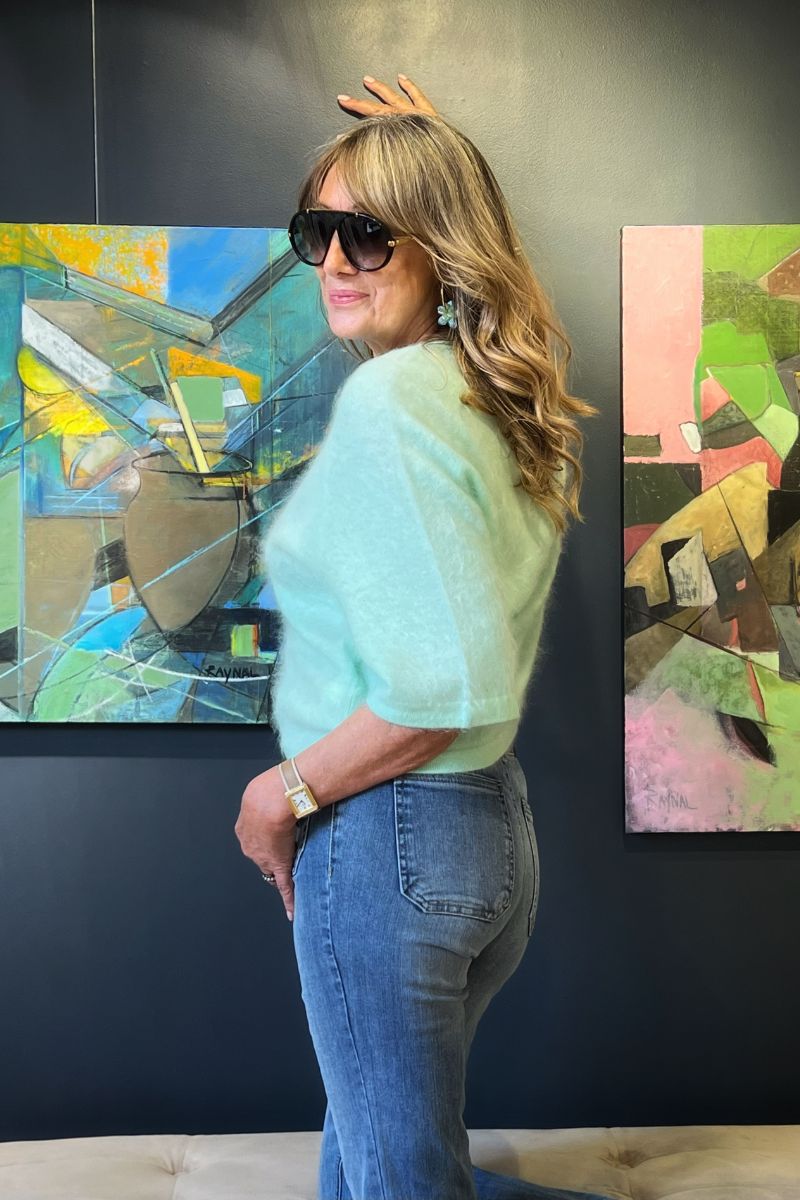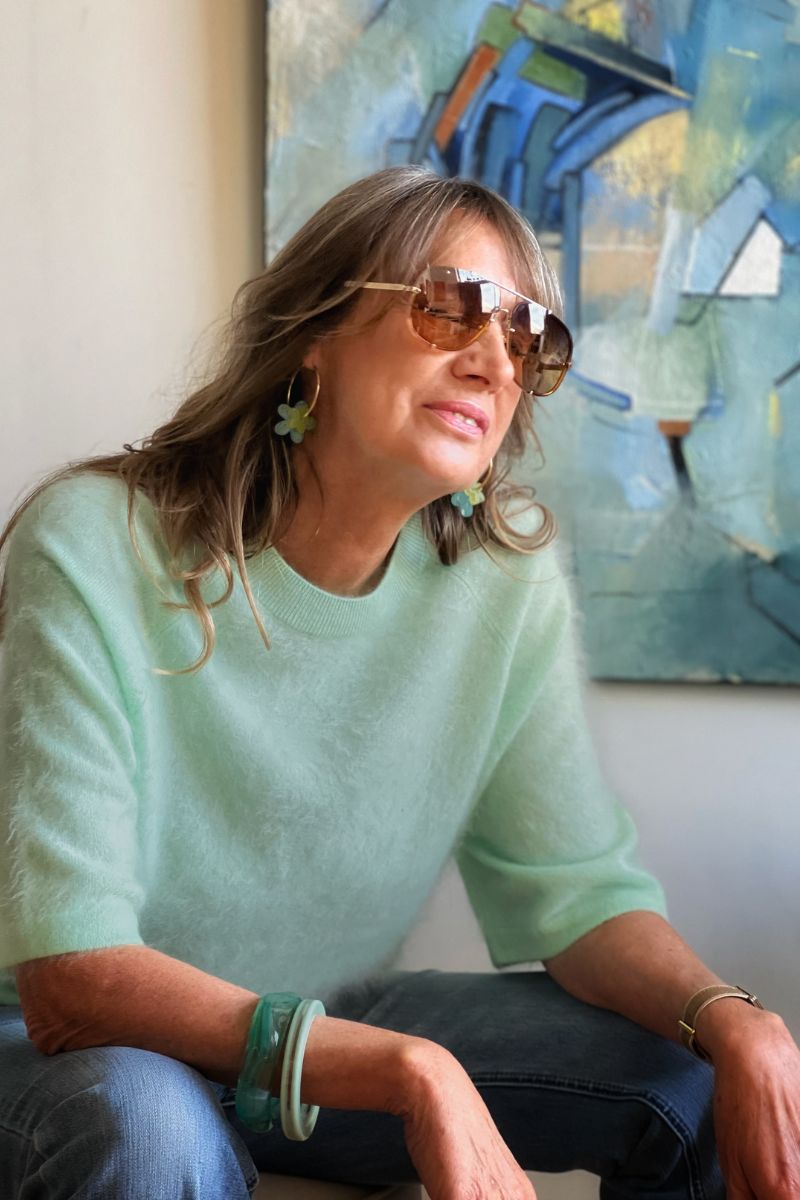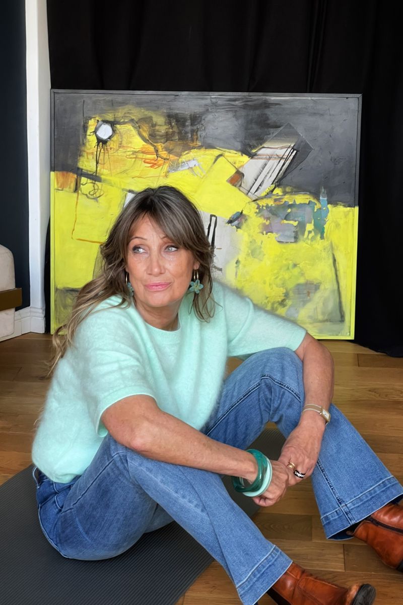 Le vert tendre du pull capte la lumière et répond aux couleurs des tableaux. Le denim structure l’ensemble et apporte cette touche intemporelle que l’on aime chez MPB.