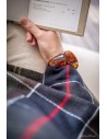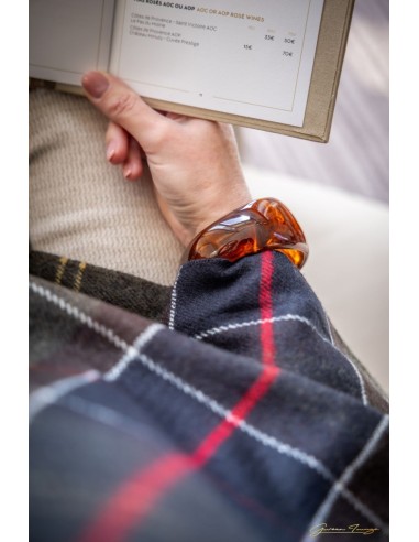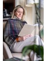 Grand châle à larges carreaux tissé dans les tons automnaux bleu marine, marron et vert.